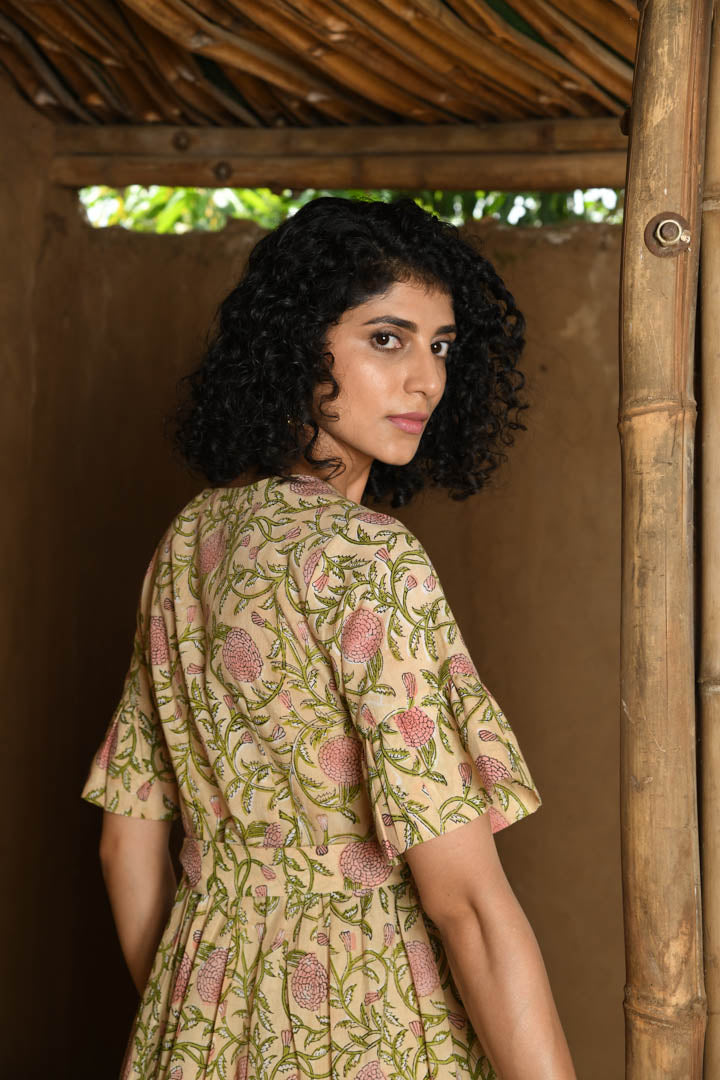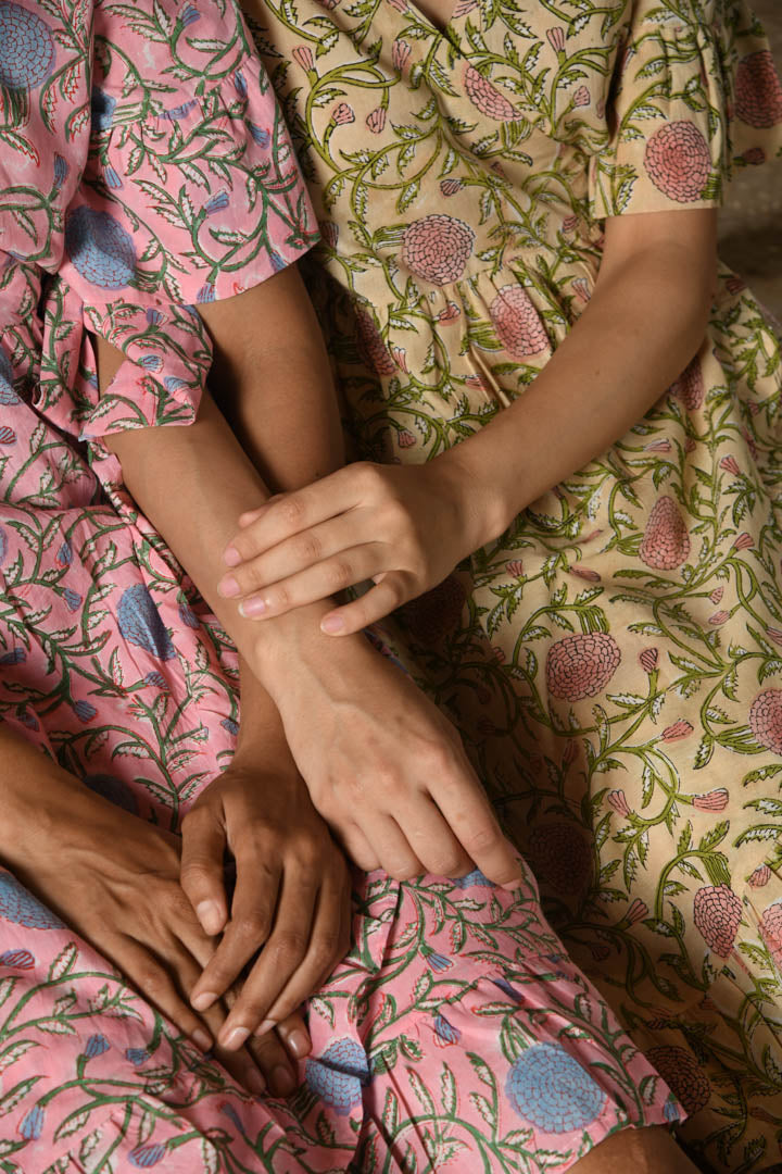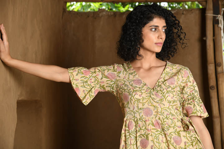 Introducing our enchanting wrap dress, crafted from luxurious 100% cotton and adorned with beautiful hand block prints in a mesmerizing mix of pink and yellow shades. Being a wrap dress, you can customize the fit according to your preference, allowing you to wrap it for a loose, relaxed look or a snug, tailored silhouette. The wrap design ensures a perfect fit, ideal for a party or a day at the beach, this dress seamlessly combines style and versatility for any occasion.